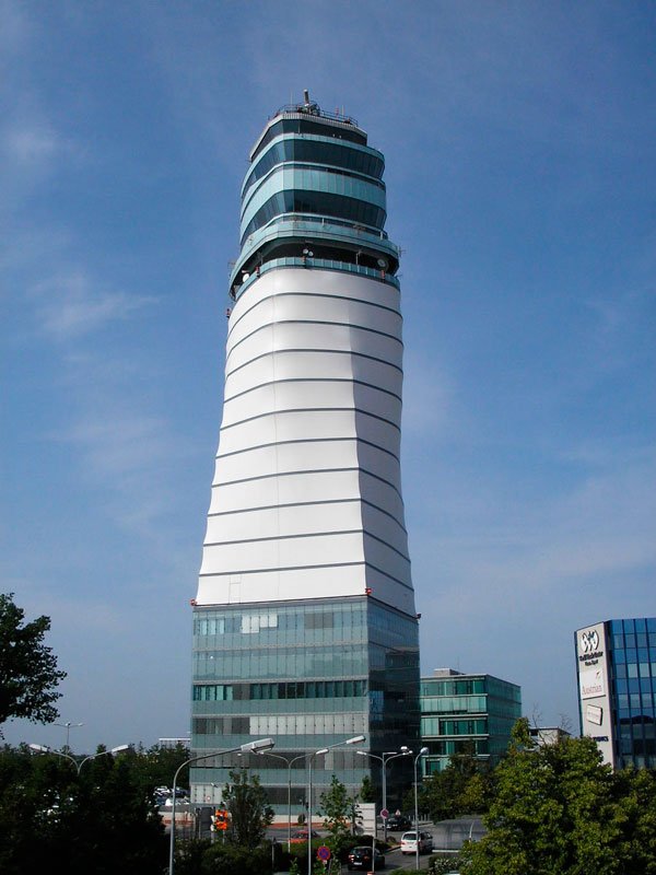 La torre de control del tráfico aéreo de 109 m de altura del Aeropuerto Internacional de Viena, se localiza en la entrada principal de las instalaciones cubriendo una superficie total de 3.300 m². La torre fue construida con una cimentación combinada en placa-pila y una estructura principal enteramente compuesta de hormigón armado.