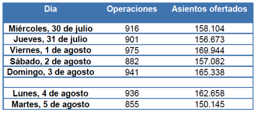 En cuanto al número de operaciones, está previsto que se registren 6.406 vuelos durante los siete días de operación salida, un 4,9% más que el año pasado. Según las previsiones, los días con mayor actividad en número de operaciones de aeronaves son el viernes, 01 de agosto, y el domingo, 3.