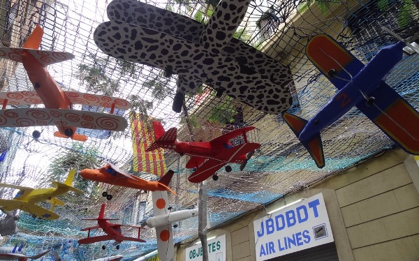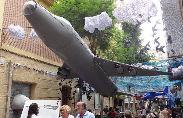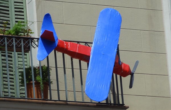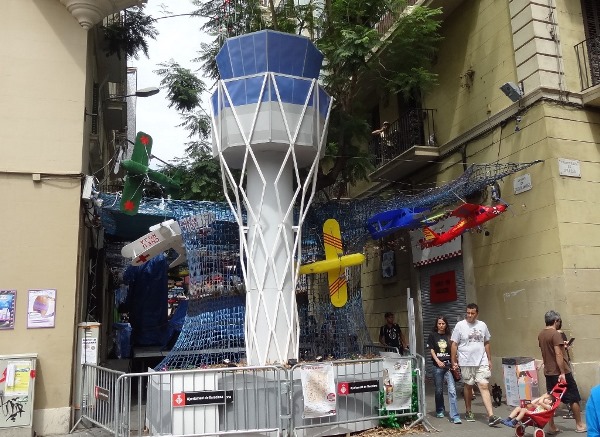 Las fiestas se realizan este año del 15 al 21 de agosto. AeroBCN.com visitó ayer el barrio y quedó gratamente sorprendido al comprobar que una calle, la de Joan Blanques, se había decorado como el ‘Aeroport de Gràcia’. La entrada por un extremo de la calle está adornada con un gran avión cuatrimotor despegando.