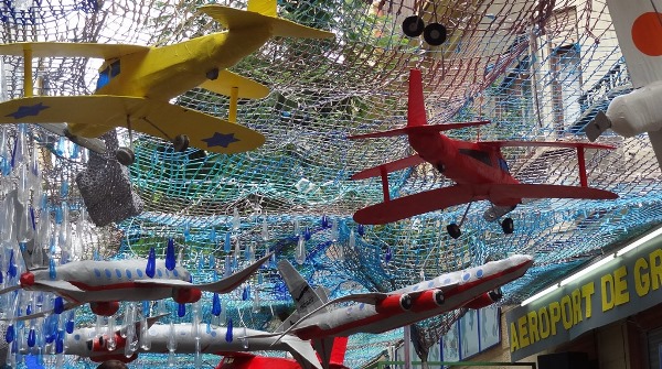 En el otro extremo, una réplica de la torre de control del Aeropuerto de Barcelona recibe al visitante. En medio, multitud de aviones cuelgan enmitas de la calle y en los laterales se reproduce la entrada al edificio terminal y se simulan los carros que transportan los equiajes o la puerta de embarque.