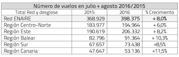 Durante los meses de julio y agosto, ENAIRE ha gestionado un total de 398.375 vuelos en el conjunto del espacio aéreo español, un 8% más (29.446 más) que en el mismo período del pasado año 2015 (368.929).