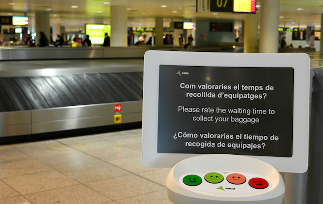 El sistema, que ha estado instalado a modo de prueba desde en 2014 en los controles de seguridad de los Aeropuertos Adolfo Suárez Madrid- Barajas y Barcelona-El Prat, permite medir el grado de satisfacción del pasajero sobre un servicio concreto, además de detectar aquellos fallos que puedan resultar del mismo.