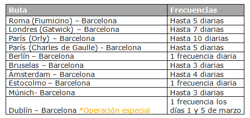 La aerolínea líder en el Aeropuerto de Barcelona-El Prat, incrementará las frecuencias de algunos de sus vuelos durante este encuentro desde las principales capitales europeas como Londres (Gatwick), Dublín, Berlín, Múnich, Bruselas, Ámsterdam, Estocolmo, París (Charles de Gaulle y Orly) o Roma (Fiumicino).