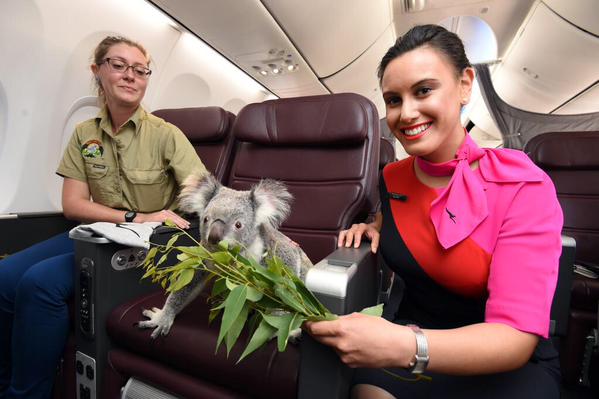 La graciosa imagen, en la que una tripulante de cabina ofrece al animal una ramillete de hojas de eucalipto, se tomó antes de comenzar el vuelo, pues por motivos de seguridad en realidad los koalas viajaron en la bodega de carga durante las siete horas que duró el trayecto.