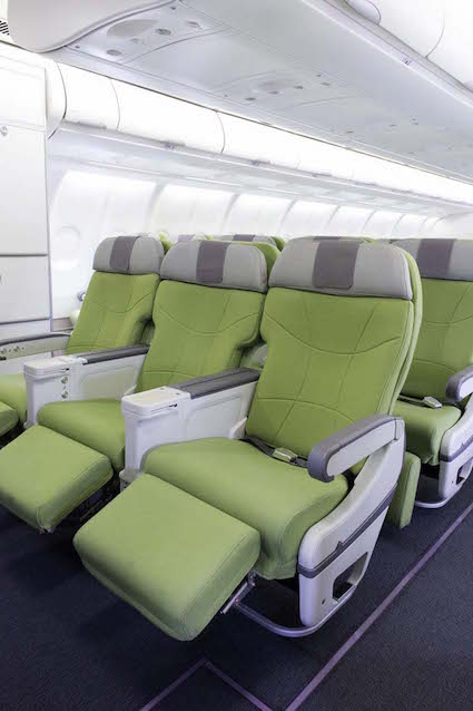 Cada una de las butacas del nuevo avión, tapizadas en un llamativo color verde, dispone de su propia bandeja oculta en el apoyabrazos, lo que permite tener una total independencia respecto al respaldo del asiento anterior, y viene equipada con una fuente de alimentación eléctrica USB para dispositivos móviles, como tablets o teléfonos.