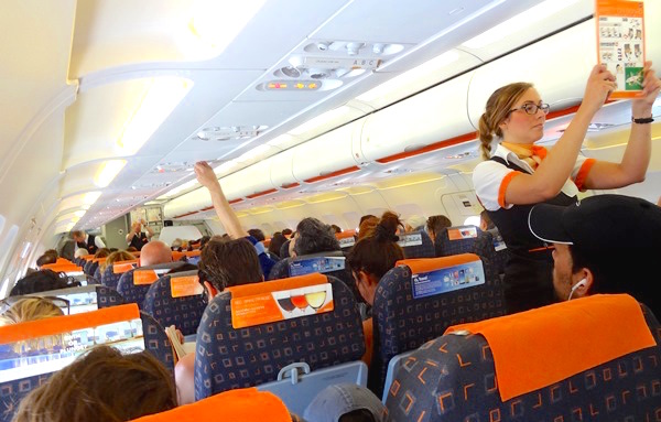 Una tripulante de cabina de EasyJet explica ls consejos de seguridad antes de comenzar un vuelo / JFG
