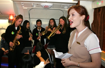 Para ello convencieron a los músicos de la Baradene College Concert Band, que casualmente viajaban en el mismo vuelo. Les solicitó que actuaran para los futuros esposos en el Onboard Lounge mientras un miembro de la tripulación con talento musical entonaba ‘What a Wonderful World’ de Louis Armstrong. Para satisfacción del pretendiente y sus improvisados cómplices, la respuesta de la novia fue afirmativa.