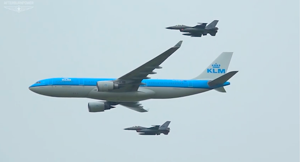 El pasado 11 de junio se celebróen la base holandesa de Leuwarden una jornada de puertas abiertas y un festival aéro. En el marco de la exhibición intervino un Airbus A330-200 de la compañía KLM que efectuó una pasada en formación acompañado por dos F-16. El vídeo muestra los preparativos y desarrollo de la formación.