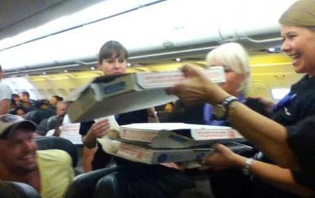 El avión despegó ya con una hora de retraso del aeropuerto Washington-Ronald Reagan con destino a Denver. Pero a causa del mal tiempo tuvo que desviarse al aeropuerto de Cheyenne, capital del estado de Vyoming, lo cual incrementó las horas de retraso en llegar al destino. Entonces, el piloto encargó a la empresa Domino’s Pizza 35 pizzas, que en una media hora llevó un repartidor escoltado por la policía hasta la escalerilla del avión.
