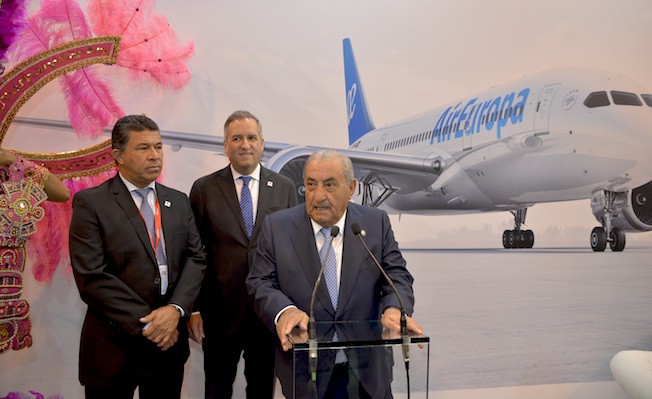 El vicepresidente de Honduras, Ricardo Álvarez; el presidente de Air Europa, Juan José Hidalgo, y el ministro de Turismo de Honduras, Emilio Silvestri, han presentado hoy en el stand de Globalia en Fitur, la primera cita turística internacional del año, la nueva ruta a San Pedro Sula, que la aerolínea empezará a operar con una frecuencia semanal a finales de abril.