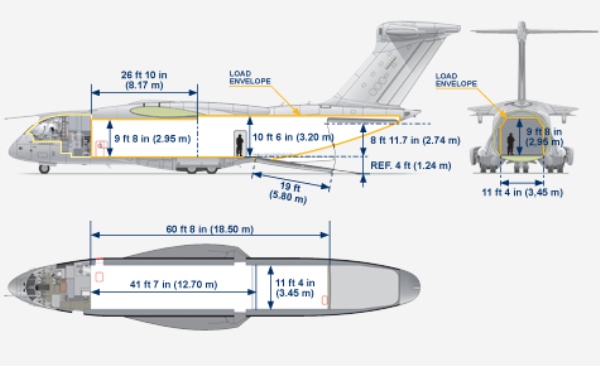 El KC-390 es un avión de carga, transporte y reabastecimiento de tamaño medio, capaz de transportar hasta 23 toneladas de carga, incluidos vehículos blindados de ruedas. Tiene una longitud de 35,20 metros, una envergadura de 35,05 metros y una altura de 12,5 metros.