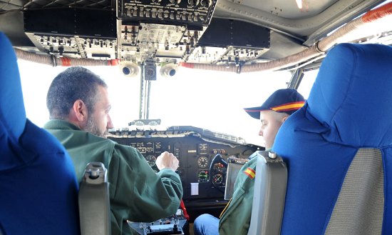 A continuación se visitó al 43 Grupo de Fuerzas Aéreas, Gustavo vio de cerca un Canadair, uno de los aviones apagafuegos de los que dispone la unidad, el pequeño pudo disfrutar también de la experiencia de pilotar el avión gracias al simulador de vuelo.