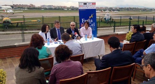 El alcalde de Mataró, Joan Mora, presentó ayer en el Aeropuerto de Sabadell el programa de la Festa al Cel, que tendrá lugar el próximo fin de semana en Mataró, en especial el domingo 28 de 11 a 15 horas. Le acompañaron la directora del aeropuerto de Sabadell, Ana Molés; el vicepresidente del Aeroclub Barcelona Sabadell, Pere-Joan Nogueroles; y el director del festival, Daniel Ventura González.