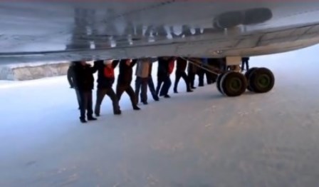 Los pasajeros de un avión operado por la compañía Katekavia que se disponía a realizar un vuelo regional en Siberia tuvieron que bajar de la nave y empujarla para que se desprendiera del suelo helado al que se había pegado su tren de aterrizaje.