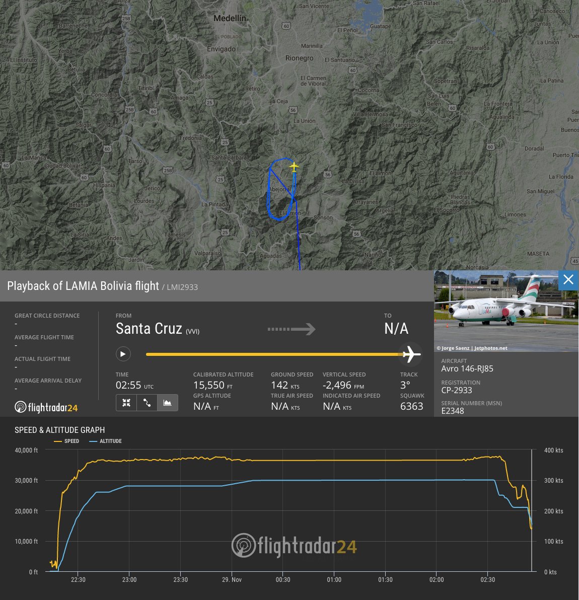 El avión British Aerospace Avro 146-RJ85, matrícula CP-2933, de la compañía boliviana LAMIA, se estrelló cuando se aproximaba ayer al aeropuerto de Medellín, en Colombia, entorno a las 22 hora local.