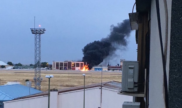 Un avión monomotor Cirrus SR22-GTS, matrícula EC-KJO, colisionó ayer contra el edificio de los bomberos del Aeropuerto de Cuatro Vientos (Madrid), incendiándose a continuación y causando la muerte a los dos ocupantes, dos hombres de 46 años instructores de vuelo.