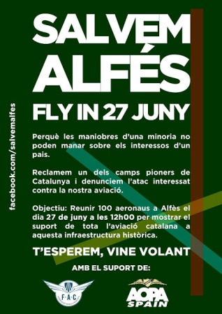 Con el apoyo de la Fderación Aérea Catalana y AOPA Spain (asociación de propietarios de aviones privados) se organiza para el próximo sábado 27 de junio una concentración de aviones en el aeródromo de Alfés, ubicado en Lleida.