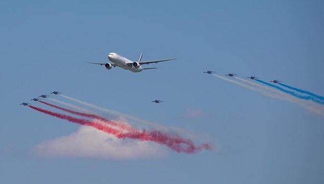 El domingo, para cerrar el festival, la Patrulla de Francia voló en formación junto a un Boeing 777 de Air France, momento que recoge el vídeo.